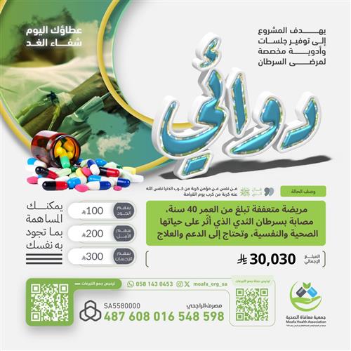 مريضة متعففة تبلغ من العمر 40 سنة، مصابة بسرطان الثدي الذي أثّر على حياتها الصحية والنفسية، وتحتاج إلى الدعم والعلاج